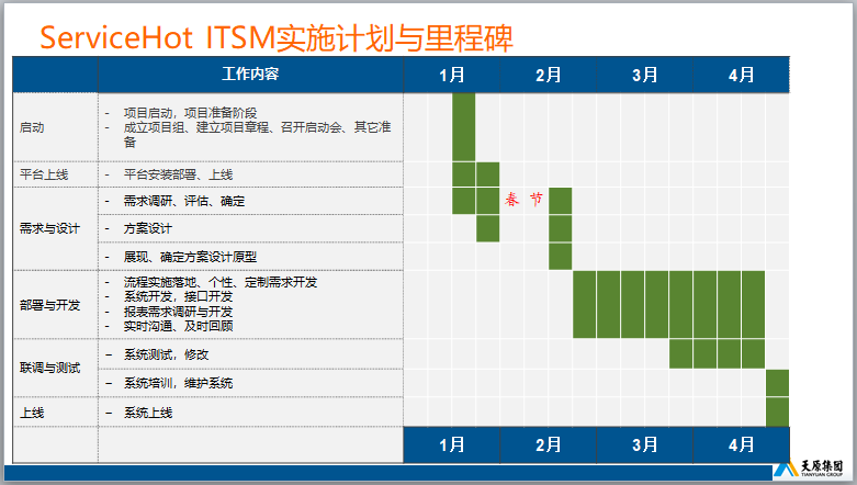 基于ITIL最佳實(shí)踐業(yè)務(wù)架構(gòu)設(shè)計(jì),ServiceHot為天原集團(tuán)制定了以下實(shí)施方案: