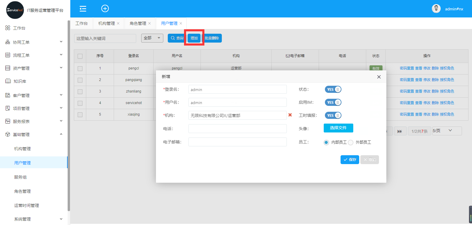 選擇「基礎管理」>>「用戶管理」進入如下圖新增用戶管理界面;