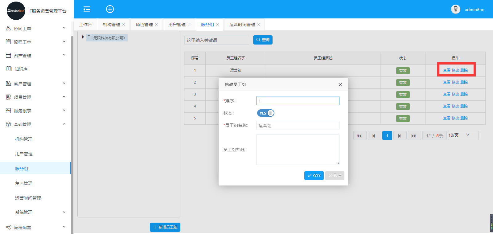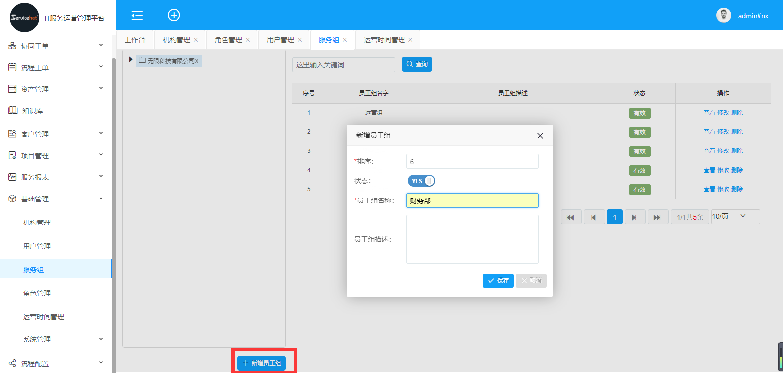 選擇「基礎管理」>>「服務組管理」進入如下圖新增員工組界面;