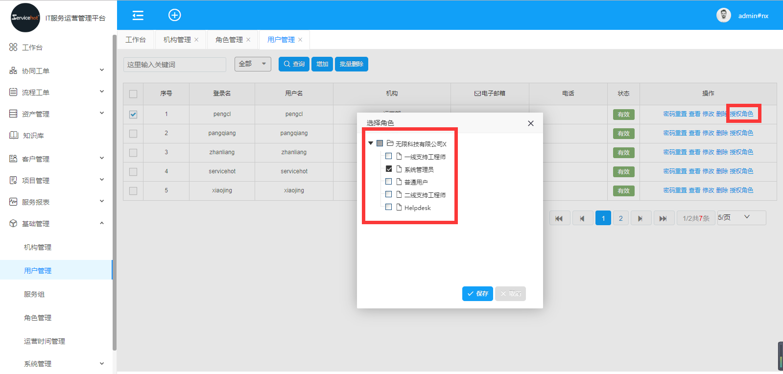 選中用戶信息,點擊右邊授權角色按鈕,進行用戶的角色配置,設置完成點擊保存;